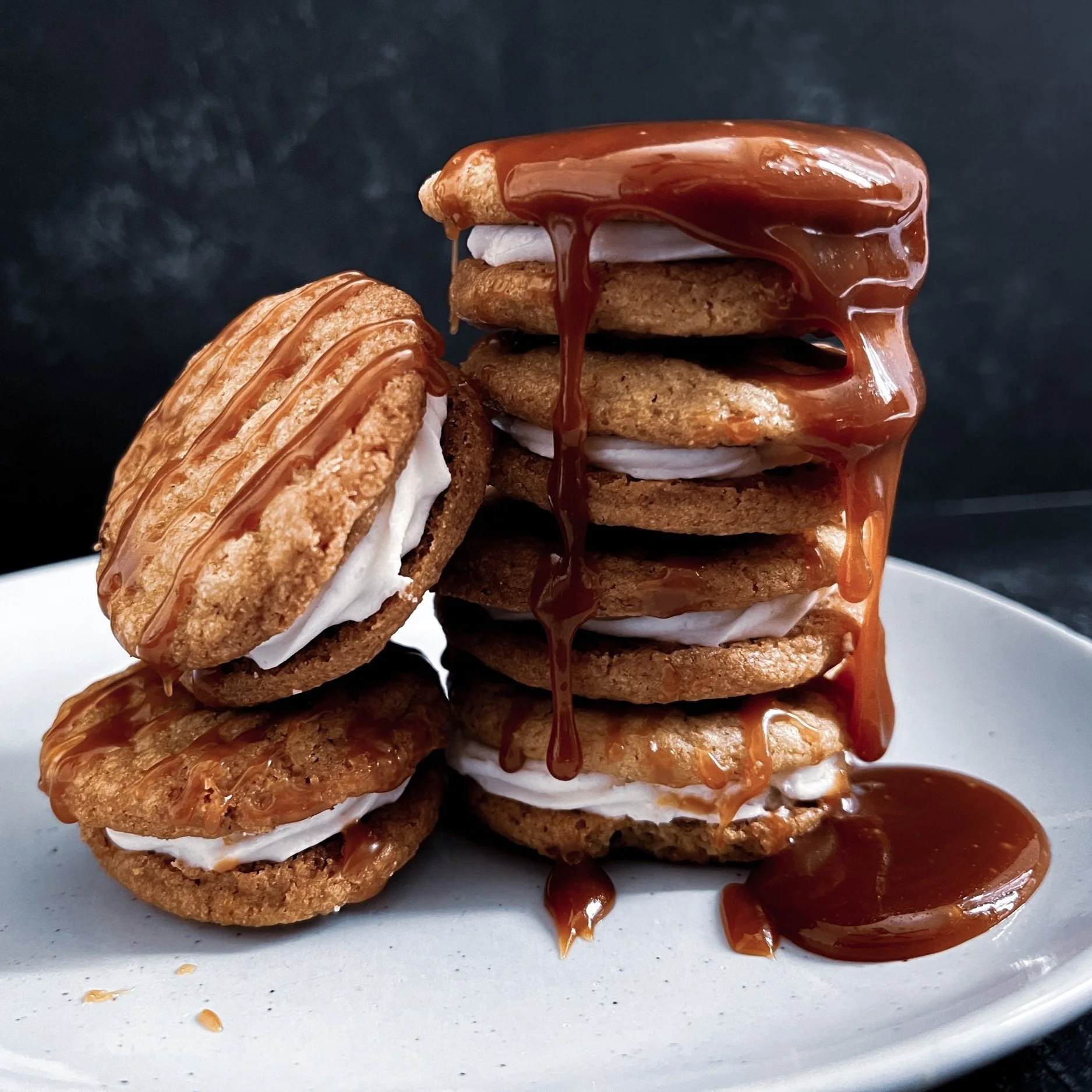 Salted caramel and buttercream sandwiched between two soft brown sugar cookies. Topped with a salted caramel drizzle.